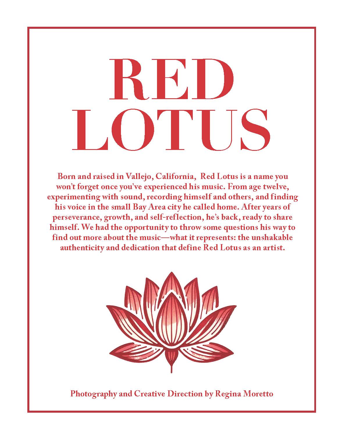 My Father was called Red, I’m the fourth, so my family called me lil Red. Lotus is a symbol of who I am. The lotus flower grows in dark murky waters then blossoms to reveal something great.